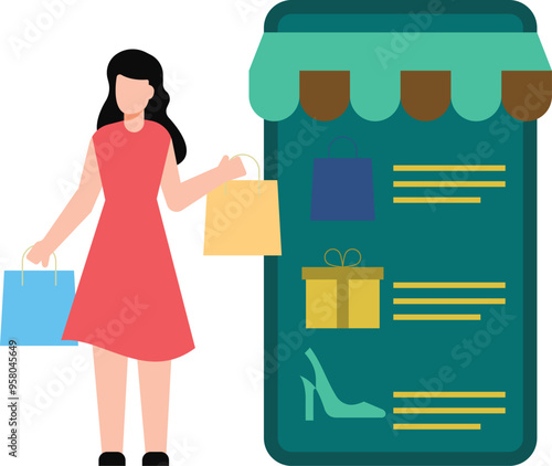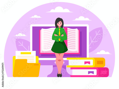 Hotel housemaid flat vector illustration. Cleaning lady or housekeeper standing next to cart with clean bed linen and towels.