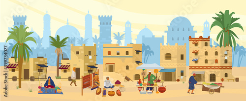 Vector illustration of hotel, egyptian resort on the beach with swimming pool, bar, lounge chairs, palm trees and tourists taking rest. Trip to Egypt concept flat style design element.