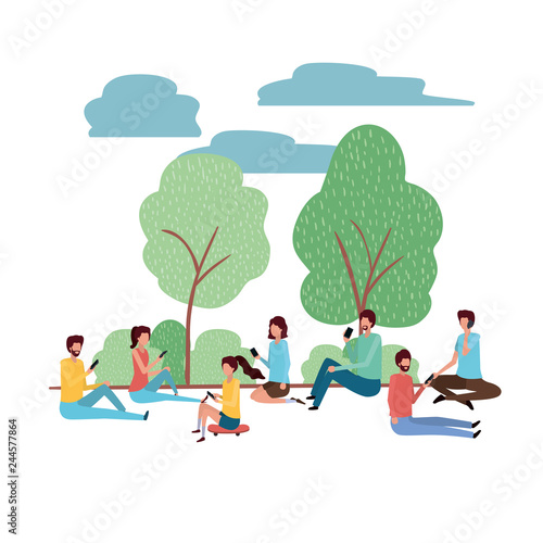 Hotel scene set, flat vector illustration. Porter carrying luggage for tourists, hotel guests relaxing by swimming pool, going sightseeing. Summer vacation, travel, hospitality industry.