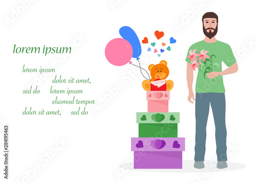 Vector illustration of hotel guest male paying for hotel services at reception. Hotel people flat style design element, icon isolated on white background.