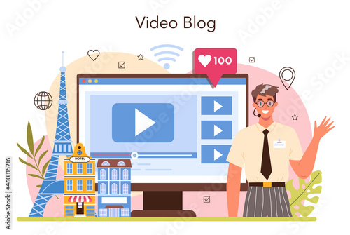 Male character in white apron serving food in guest room, vector illustration. Hotel room service concept for web banner, website page etc.