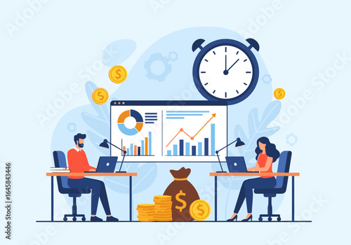 Receptionist and hotel porter or doorman services, vector illustration. Hotel check in, hotel staff hospitality concept for web banner, website page etc.
