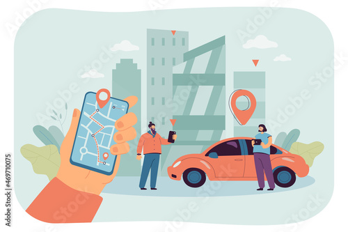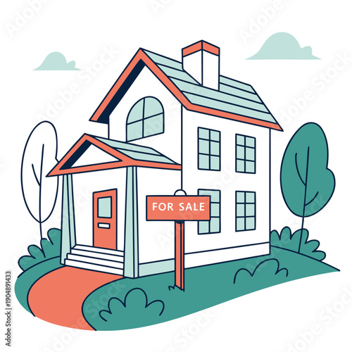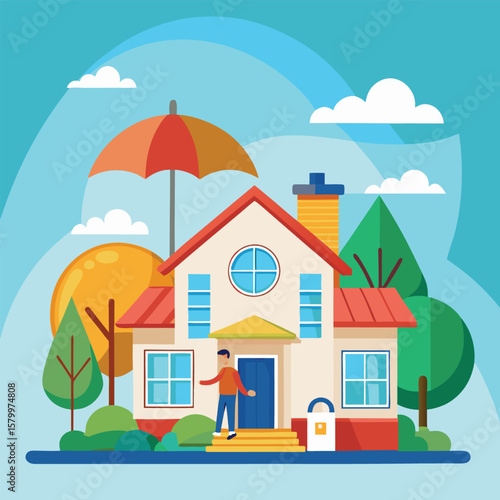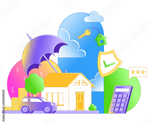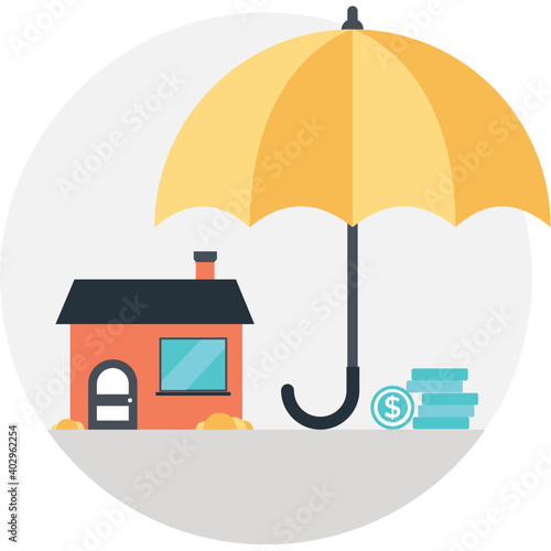 House and car under umbrella, under reliable protection of insurance policy, flat vector illustration. Property insurance services.