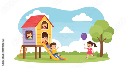 House on tree. Playground landscape. Vector children play in park with treehouse and swing. Kindergarten, school garden or outdoor summer camp