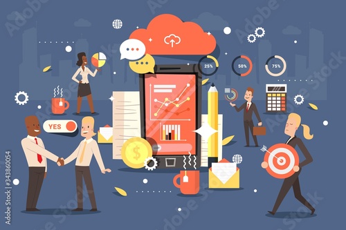 Huge mobile phone with navigation map and location pin on screen, people searching hotel or place they need. Vector flat illustration. Navigation app, car rental, carsharing service.