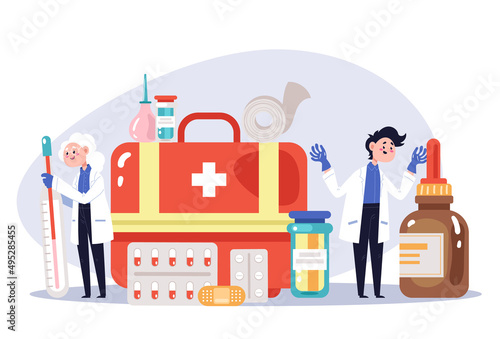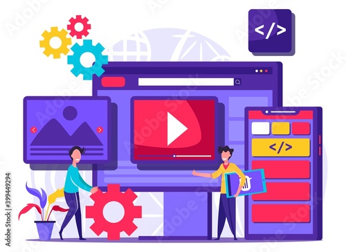 Huge tv set with film strip and video play symbol on screen, characters with popcorn, 3d glasses. Vector flat illustration. Watch tv, movie, cinema and entertainment industry, film festival concept.