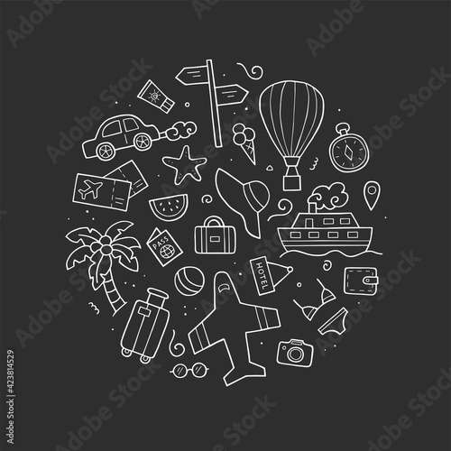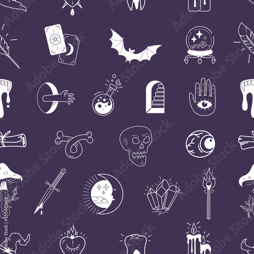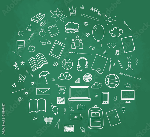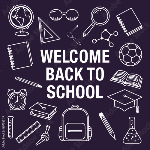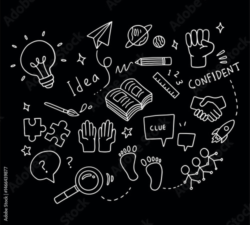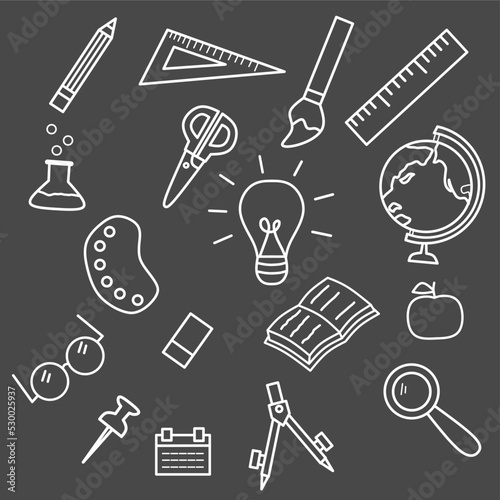 Human head and icons of science. The concept of scientific discoveries. Education and learning process. Vector illustration in linear style