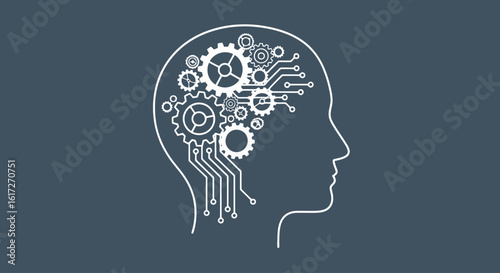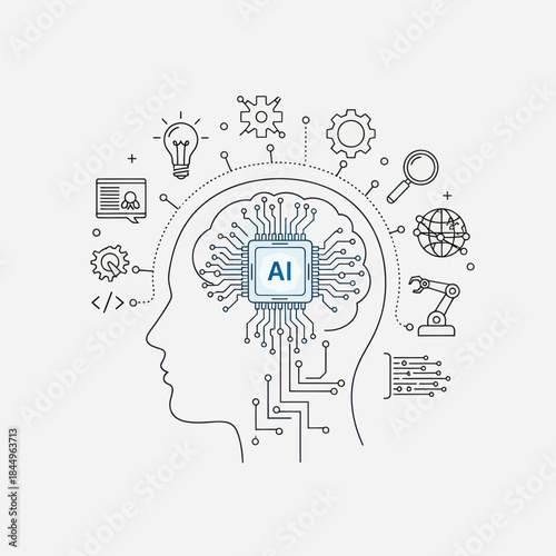 Human head and icons of science. The concept of scientific discoveries. Education and learning process. Vector illustration in linear style