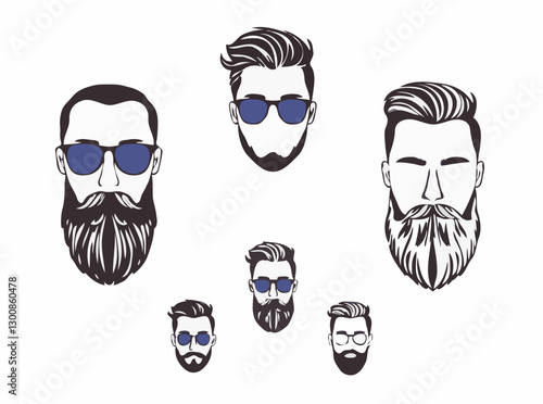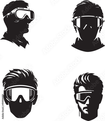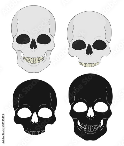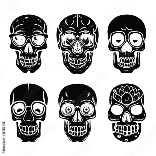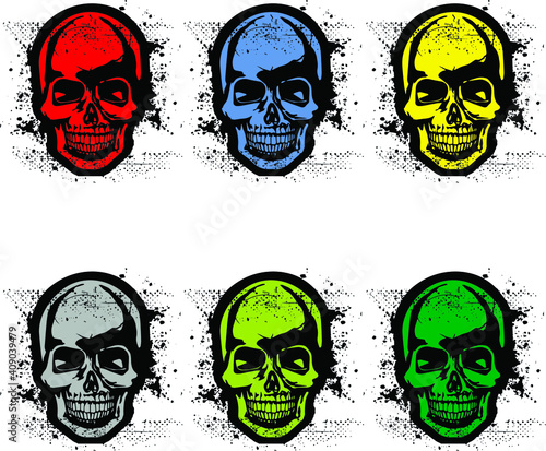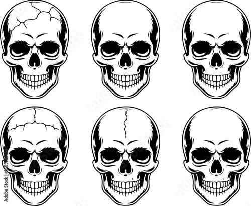 Human skull in face scarf set, vector hand drawn illustration isolated on white background. Skull with iroquois, wearing hat and cap, t-shirt graphics.