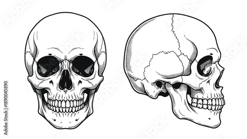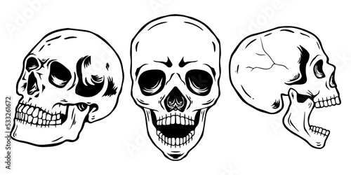 Human skull set, vector hand drawn illustration isolated on white background. Skull t-shirt graphics.