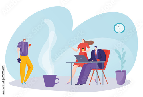 Dam energy production, vector illustration. Male and female characters engineers working at hydroelectric power plant. Hydropower electricity, energy of falling water, renewable source concept.