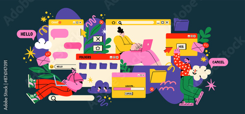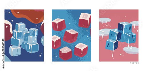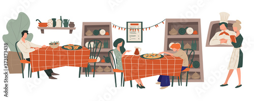 Male and female characters making and selling fruit and almond ice cream, frozen dessert, vector flat illustration. Ice cream business composition for poster, banner etc.