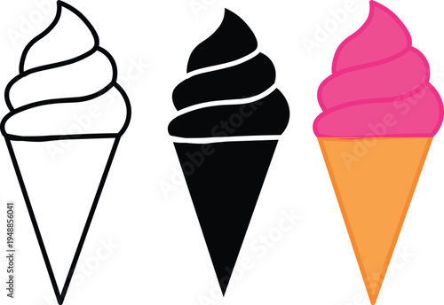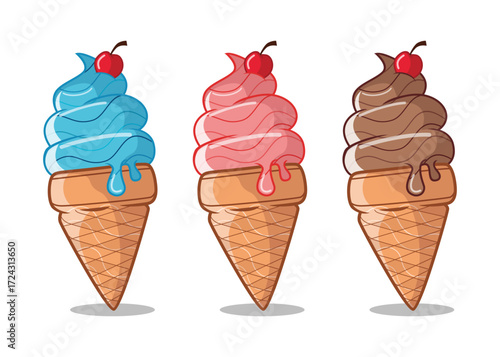 Ice cream cone icon set. Vector illustration in paper art style. Origami melting ice cream. Summer background, poster, banner, flyer design template.