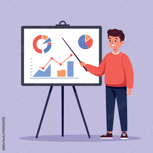 Vector illustration of businessman speaker giving presentation of what is ico using visual aids. Business conference meeting concept. Flat style design.