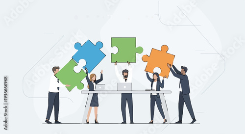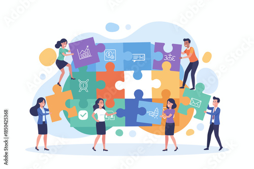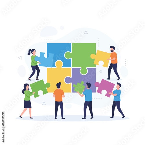Idea creation, vector flat style design illustration. Tiny business people team putting big light bulb puzzle pieces together. Brainstorming, teamwork, business innovation concept for web banner etc.