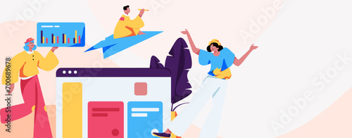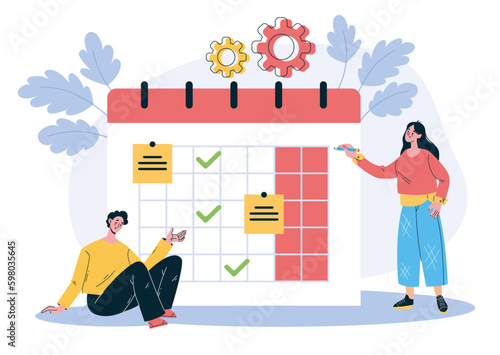 Vector illustration of industrial robotic arm picking up parcel from conveyor belt and placing it in new location, workers. Factory automation, pick and place robots concepts for web banner, webpage.