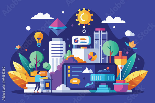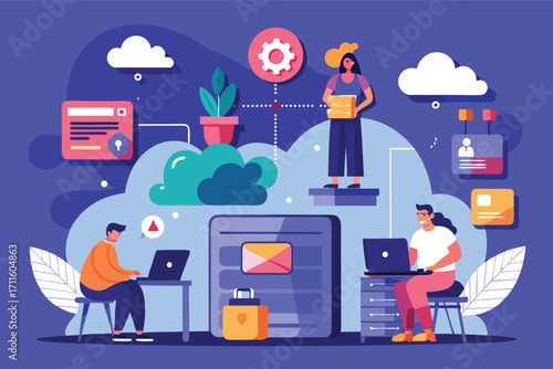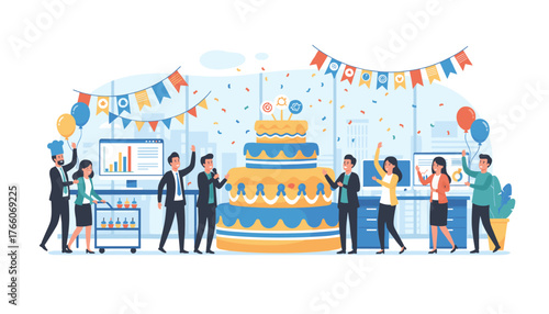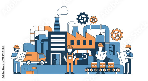 Vector illustration of industrial robotic arm picking up cardboard box from conveyor belt and factory workers engaged in their work. Robotic pick and place automation concept for web banner, webpage.