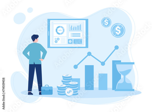 Man with shopping basket experiencing rising prices for food over time standing near calendar and rising arrow chart, flat vector illustration. Economic inflation, loss of purchasing power.