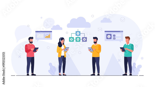 Initial coin offering concept vector illustration. Businessmen blowing balloon with ICO lettering.