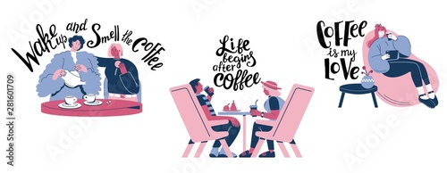 Coffee quotes hand lettering typography with happy couples enjoying latte, cappuccino or black coffee, vector flat illustration isolated on white background. Morning coffee inspirational sayings.
