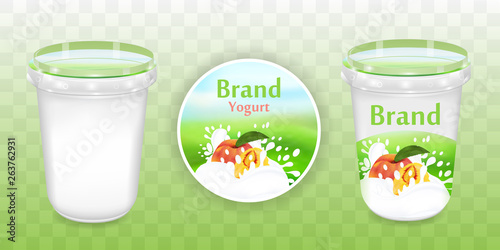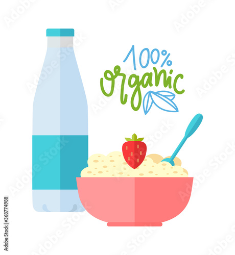 Instant oatmeal vector realistic illustration. Healthy natural product with fresh and ripe strawberry, milk splashes. Oatmeal muesli ad poster, packaging design template.