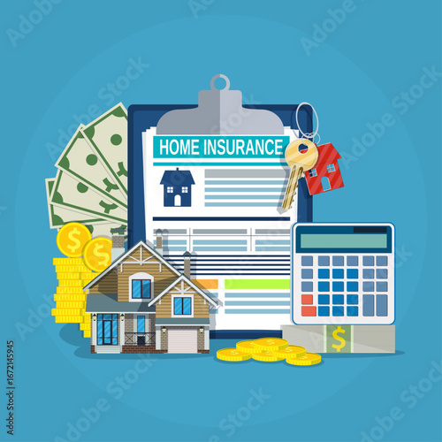 Insurance concept vector flat style design illustration. House under umbrella, globe, money, contract, lifebuoy, hand holding shield. House insurance poster, banner.
