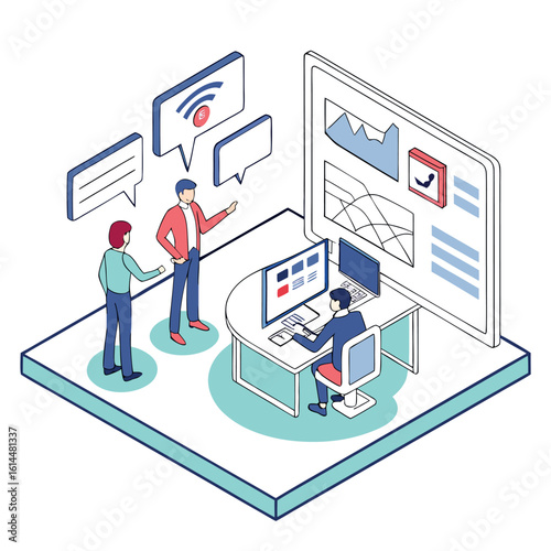 Insurance service online, vector flat isometric illustration. Man using smartphone or tablet to buy home, travel or health insurance policy.