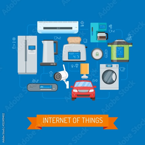 Internet of Things vector concept illustration. Household appliances, consumer electronics, auto icons. Internet of Things lettering on ribbon. Home automation concept design elements in flat style