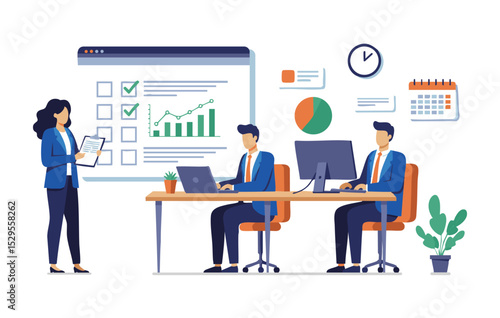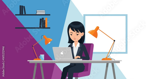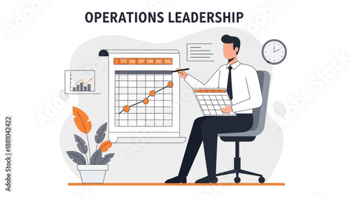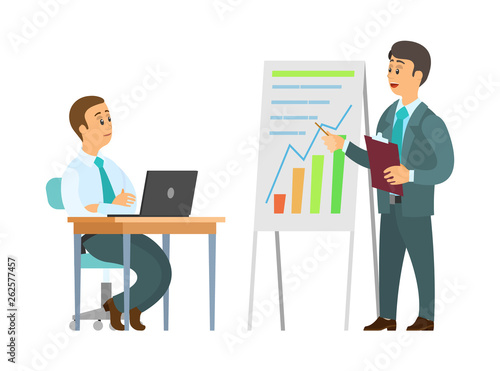 Vector illustration of office worker male sitting at the table, using computer and surfing the net while drinking tea. Internet people flat style design element, icon isolated on white background.