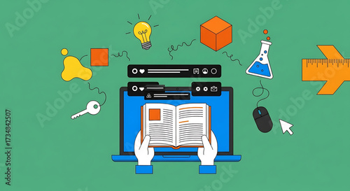 Investment in education concept vector flat illustration. Laptop ebook globe academic graduation cap, human brain, dollar coins. Business investing in human capital development poster, banner.