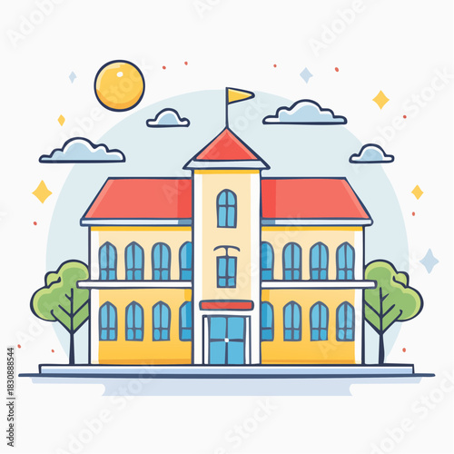 Investment in education concept vector illustration with school building, gold coins, books, school supplies, graduate cap and award cup. Flat style design element for poster, banner, print.