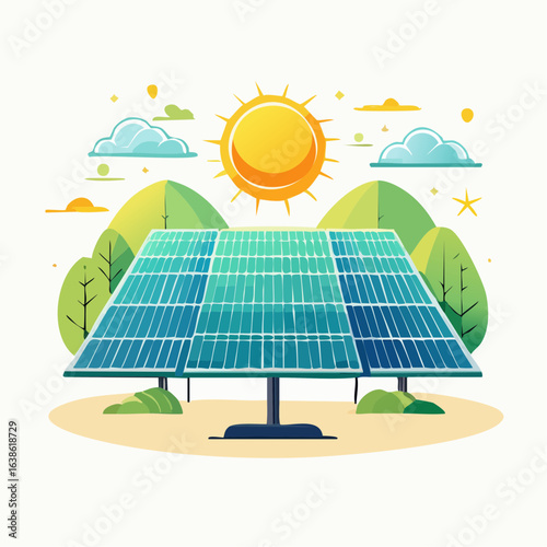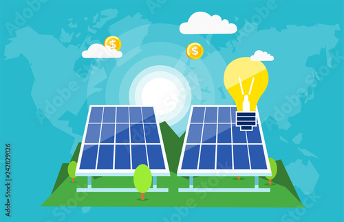 Investment in solar energy concept vector illustration. Solar panel with dollar coin and light bulb connected to it. Flat style design element for website template, poster, banner etc.