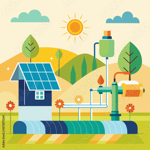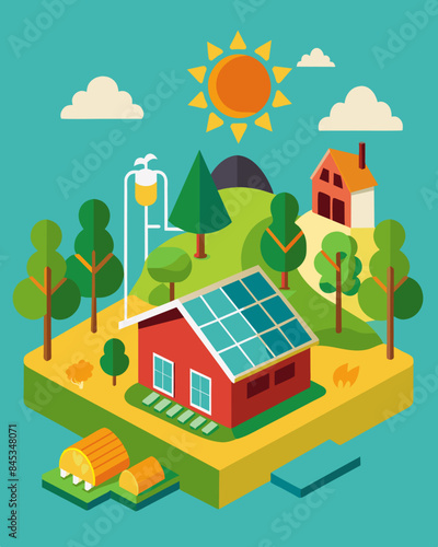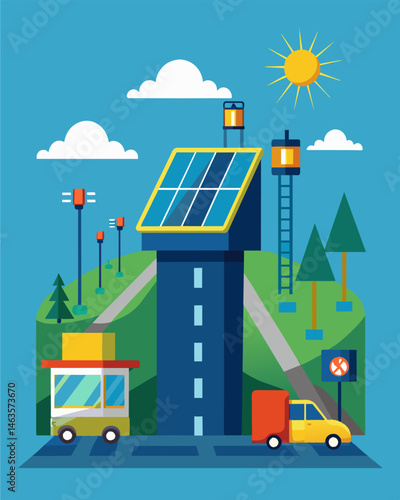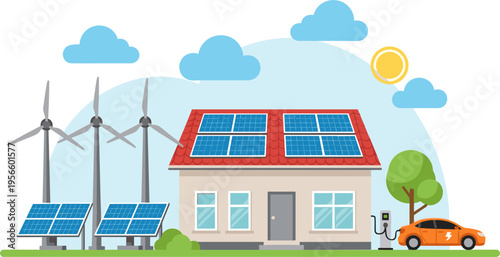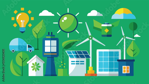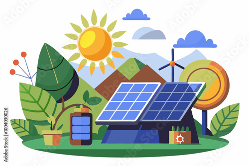 Investment in solar renewable energy concept vector illustration. Green city with wind mills, solar panel and dollar coins. Flat style design element for website template, poster, banner etc.