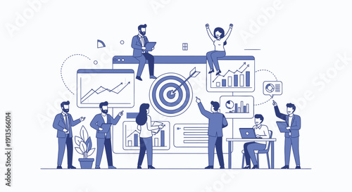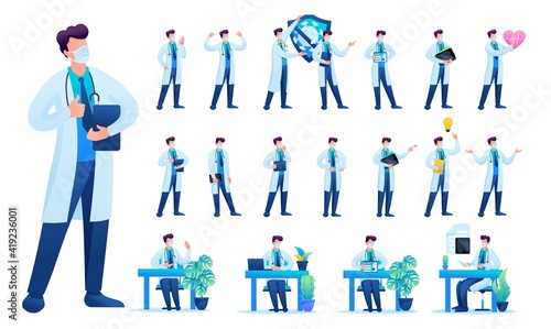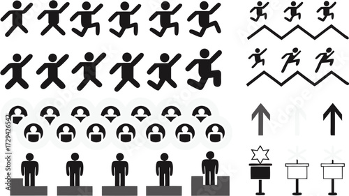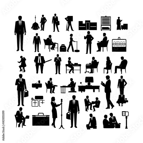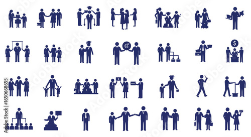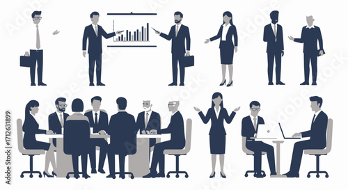 Isolated set of business people working in office, presenting speech on conference, negotiating, brainstorming, searching idea, handshaking vector illustration on white background