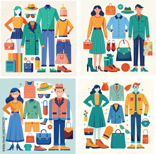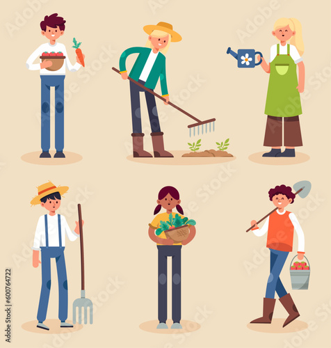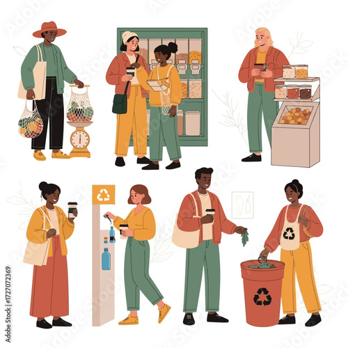 Isolated set of diverse people characters picking mushrooms. Old senior couple, young man and woman alone, happy family of parent and boy child enjoying harvesting in forest vector illustration