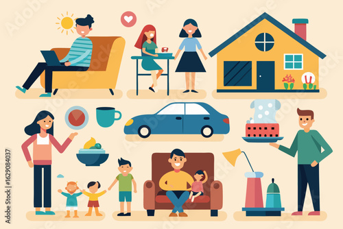 Isolated set of patient and dentist characters. Man holding tooth x-ray, little boy on checkup, orthodontist with dental tools and examination results vector illustration