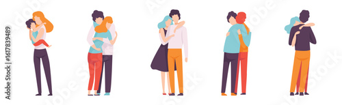 Isolated set of people couple different age view from back. Young, adult, teenage, senior and children pair of female and male characters hugging standing and sitting together vector illustration
