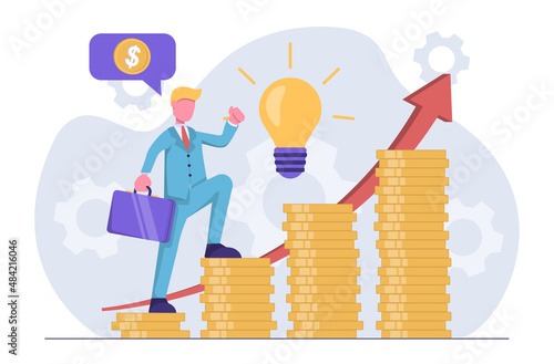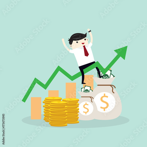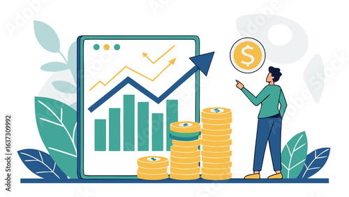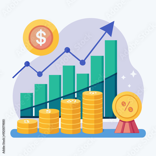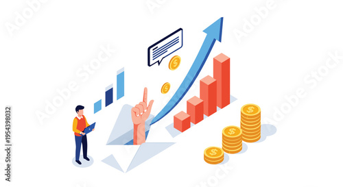 Financial investments. Isometric bank cards with people putting dollar coins into piggy box, flat vector illustration. Raising arrow bar chart. Money saving, economy.