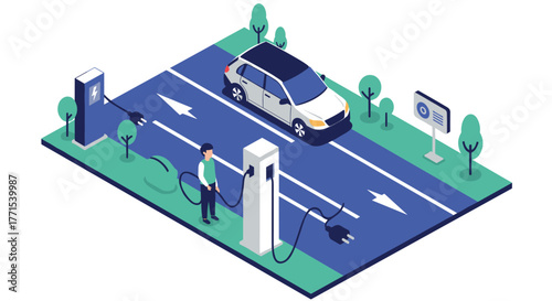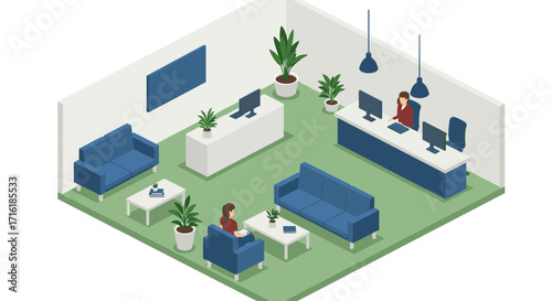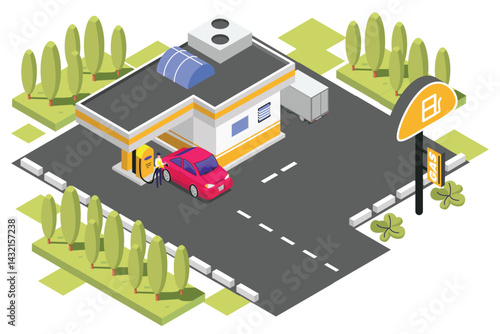 Bus stop. Disabled man in wheelchair leaving city bus using wheelchair access ramp, flat vector isometric illustration. Disabled person lifestyle. City public transport accessibility.