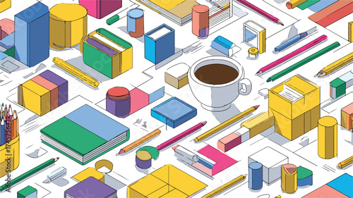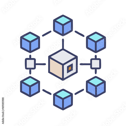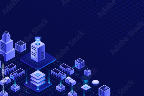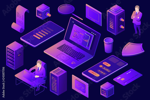 Isometric city building set, vector isolated illustration. Urban modern architecture, purple neon lighting.