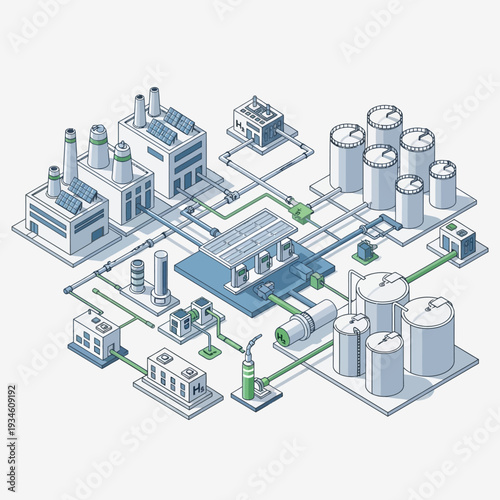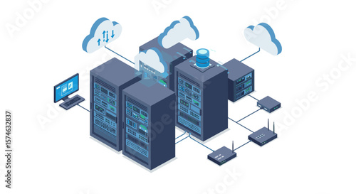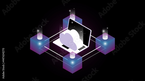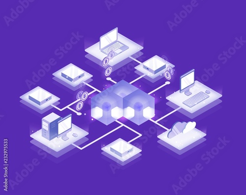 Isometric city building set, vector isolated illustration. Urban modern architecture, purple neon lighting.
