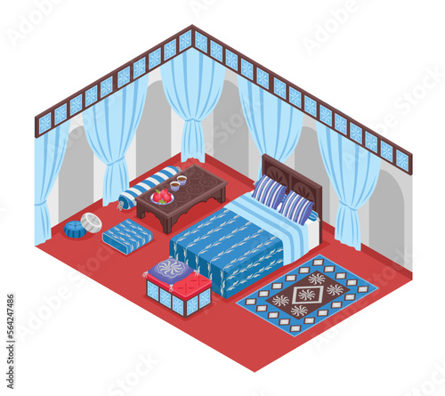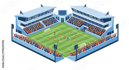 Isometric ice hockey stadium, players and fans, flat vector illustration. Ice hockey arena, rink, sport field with tribune, scoreboard.
