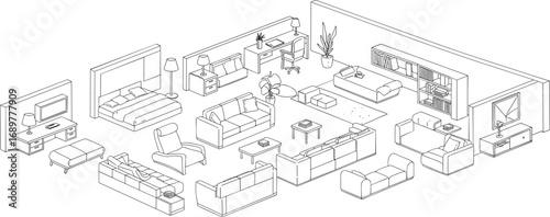 Isometric living room interior constructor. Vector set of isometric Furniture elements of home interior isolated on white background. Flat 3d design template.