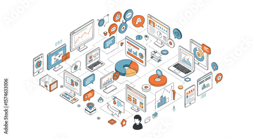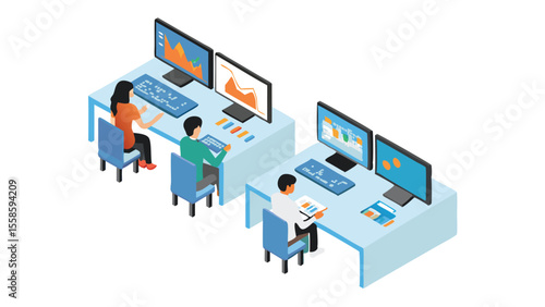 Computers and information technology, flat vector isometric illustration. IT service delivery, cdn. Software programs, apps installation. Wifi internet connection. Wireless network technology.