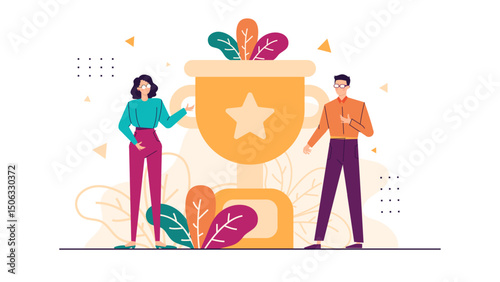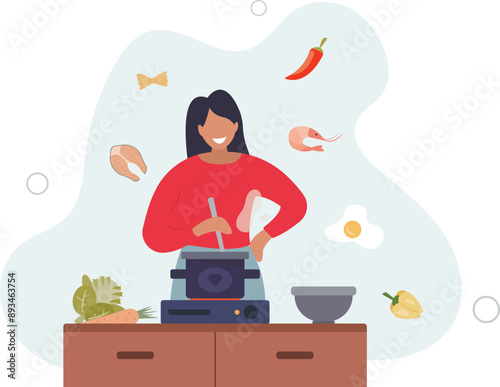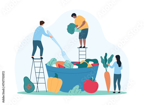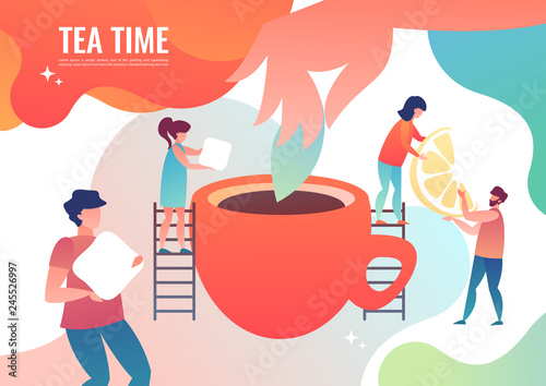 Japanese food vector illustration. Tiny characters pouring soy sauce on huge nigiri sushi with salmon on top, holding chopsticks, bowl of wasabi paste. Traditional asian cuisine, sushi bar, restaurant