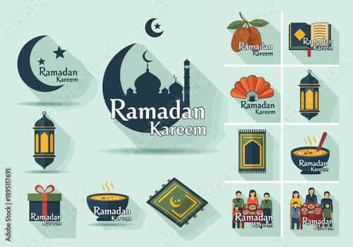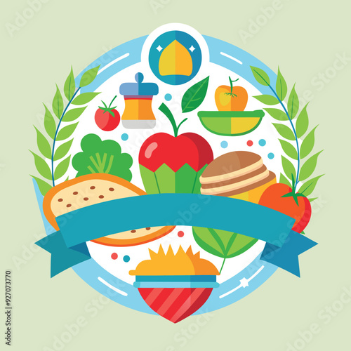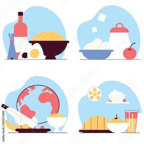 Japanese food vector flat style design illustration. Noodles or pasta in bowl, maki sushi rolls, soy sauce etc. Traditional japanese cuisine poster banner.