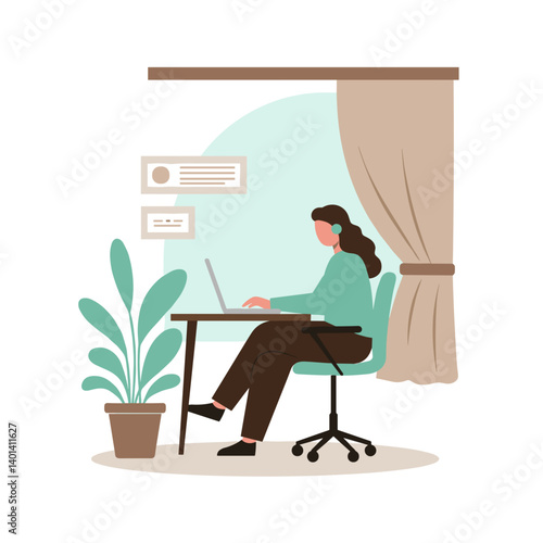 Vector illustration of office worker male using computer and drinking coffee. Job concept flat style design element.