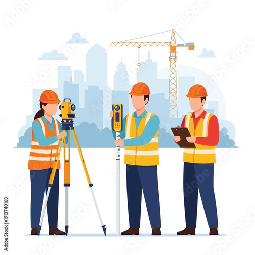 Female journalist, news reporter with microphone and cameraman shooting interview with two firefighters, flat vector illustration. Live reportage, breaking news broadcasting.