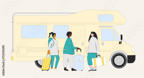 Journalists and reporters crowd with microphone waiting for press conference to begin vector illustration. Empty table podium at forum awaiting for speakers