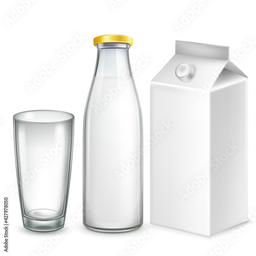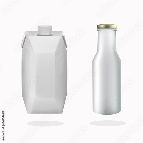 Juice and dairy product package mock up set, vector isolated illustration. Realistic white blank plastic bottle and carton pack for milk, yogurt, fruit and vegetable juice etc.